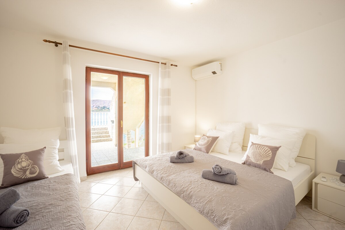 Perched on steep rocks, 30m above the sea level, this idyllic studio is a perfect getaway for a much needed vacation. Surrounded by a vegetation reserve of Dubrava-Hanzine, it offers a luxurious experience - the sweeping views of the Pag Bay and the mountain range of Velebit, for one. Beach Rozin Bok 50m from the apartment. Parking, A/C, outside grill, and outside solar shower included. SUP and kayak are available during the stay in the apartment.