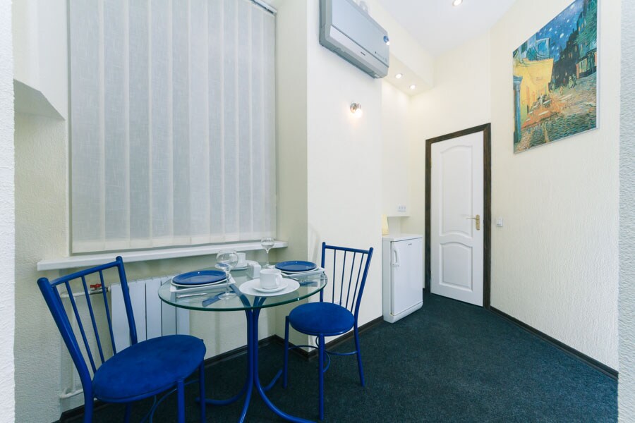 An artsy apartment in the very centre of the old town. Features high ceilings, a comfortable bed, a relic Soviet balcony, and a number of pieces by up-and-coming Ukrainian artists on the walls. The place is 5 min walk from Zoloti Vorota, 10 min walk from the Opera house and St Sophia Cathedral with its 260 m2 of authentic 11th century mosaics. Half of Kyiv's best known bars and galleries are in direct vicinity, along with the Landscape alley and St Volodymyr Hill.