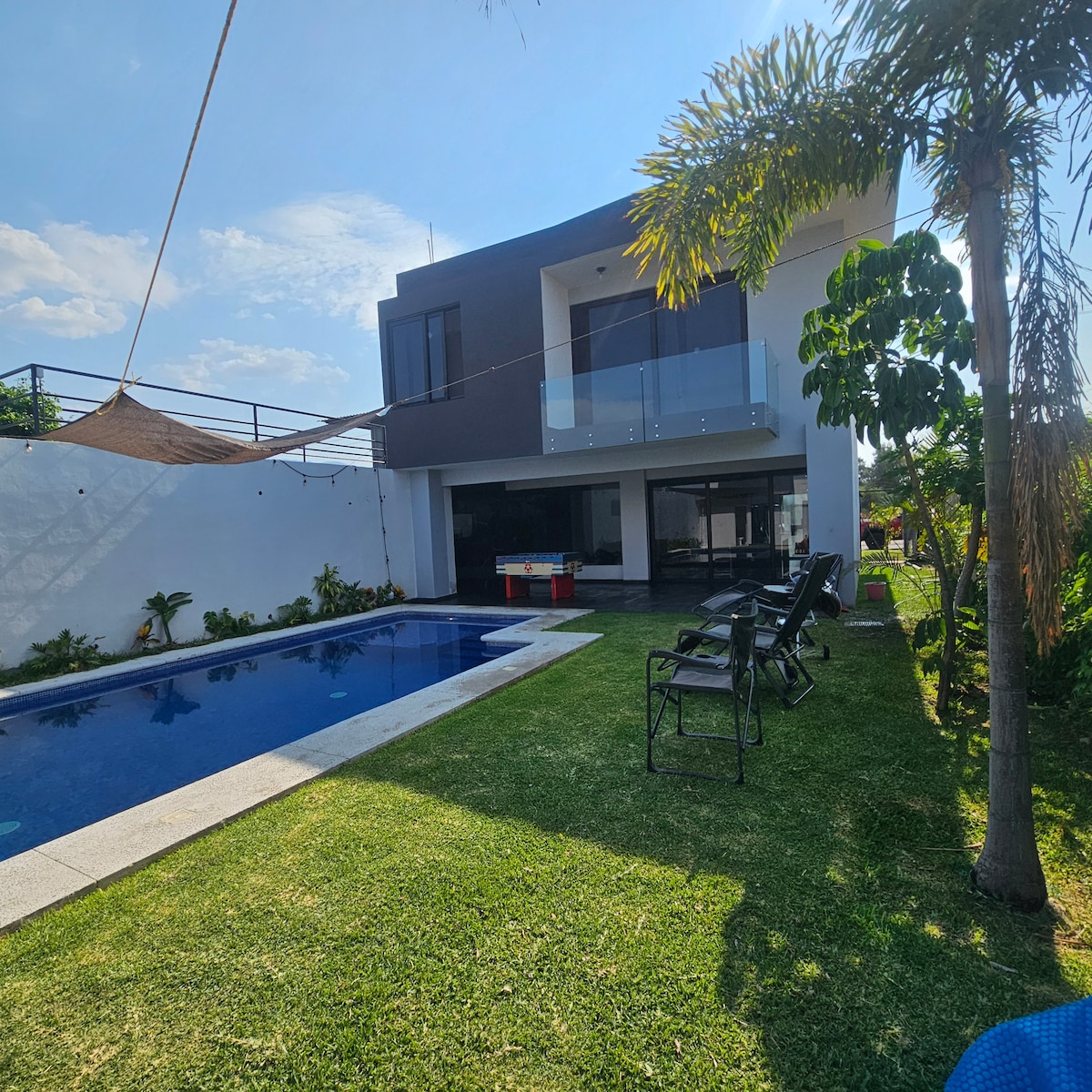 Your perfect getaway awaits you! Country house 10 minutes from Chapala, pool with heat pump, 4 bedrooms, 4 bathrooms, equipped kitchen, experience the serenity of nature, spectacular sunrises, away from the hustle and bustle of the city, large garden, terrace, covered barbecue area, trampoline, wifi, fire pit area and parking for 7 cars. Pet friendly (extra fee) security with video surveillance and alarms. Book now and create unforgettable memories with family and friends!