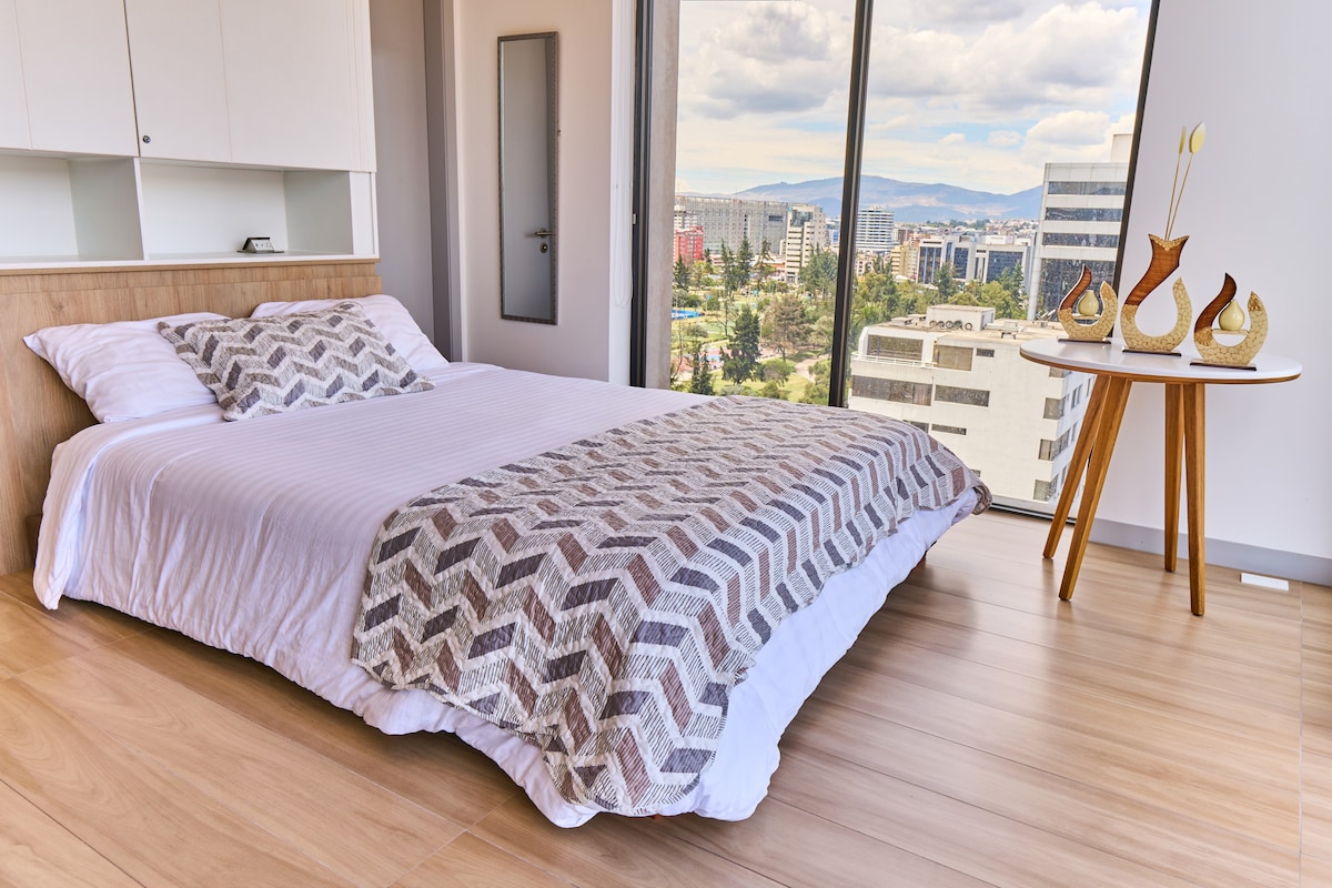 Spectacular suite located just across La Carolina Park. Imagine the view from the 17th floor, whether you're relaxing on the sofa or in bed. Features a fully equipped kitchen, fast internet, and you'll feel right at home. Easy walking access to the Subway, Mall El Jardín, and CCI. Pool - Sauna - Jacuzzi Well-equipped gym Incredible rooftop 60” Smart TV - Netflix Induction cooktop Refrigerator Laundry room inside the apartment Microwave Blackout curtains Clothes iron