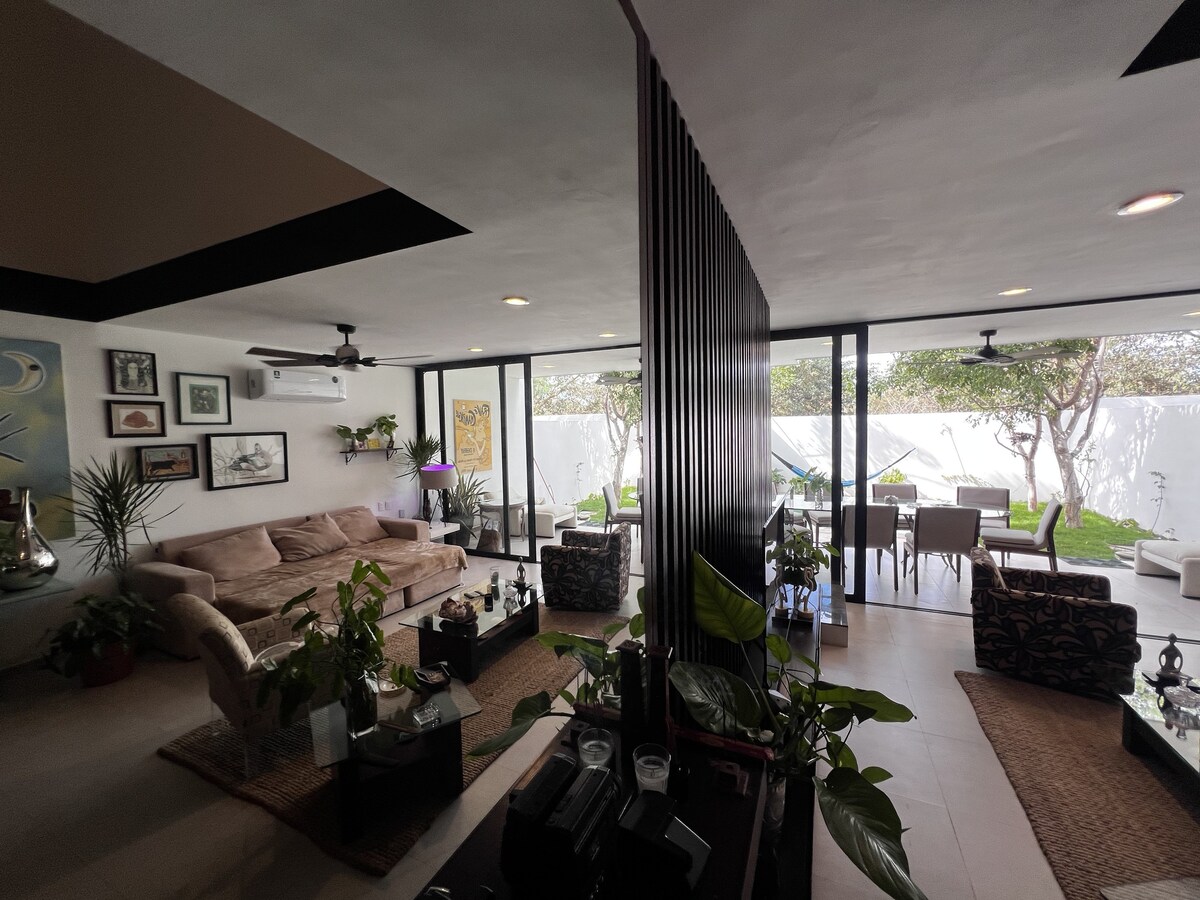 Located within a private residential area, Relax in this unique and quiet getaway. Disconnect from the routine, a spacious house with spaces that allow you to read, listen to music, contemplate sunsets, exercise, meditate, do yoga, cook and share experiences 10 minutes from the City of Mérida and 20 minutes from Puerto Progreso. Easy access to roads that go to places such as Sisal, Celestún, Izamal, Valladolid, Tulum, among others.