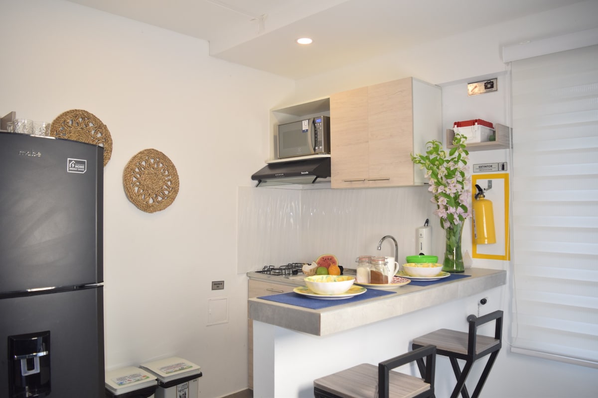 Relájate en esta escapada única y tranquila. Un aparta estudio amplio y confortable, completamente dotado. Cuenta con dos balcones privados y una zona social para su disfrute, equipada con hamaca y comedor, ofreciendo un lugar al aire libre para despejar tu mente y disfrutar del sol. incluye una sala de estar para que los residentes puedan socializar y relajarse. Adicionalmente tienes acceso a la zona de parqueadero.