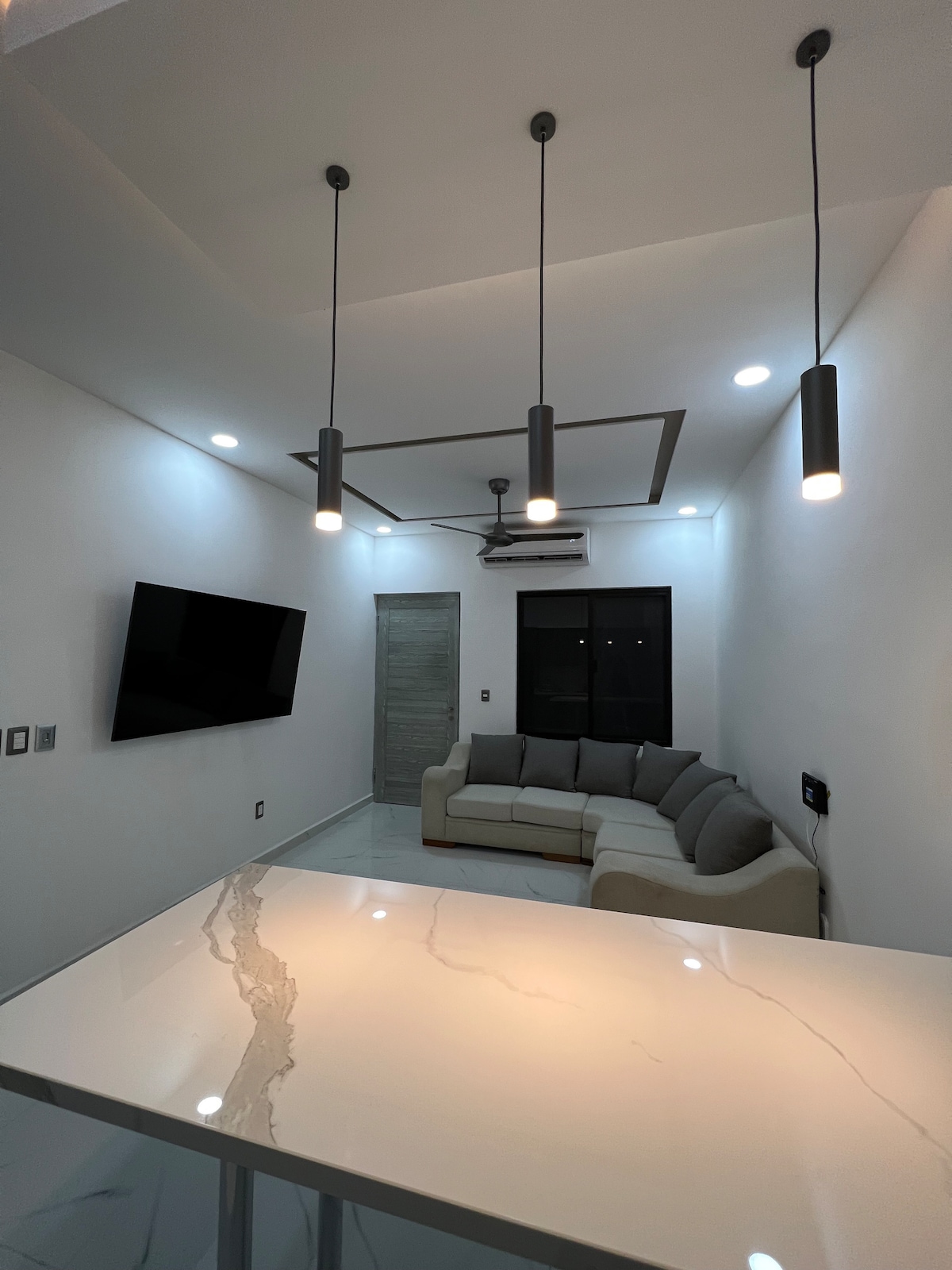 Disfruta de este acogedor departamento con 2 habitaciones equipadas con aire acondicionado, ideal para descansar. Cuenta con sala de estar con TV, comedor para compartir comidas, y una cocina completa con refrigerador, estufa y barra para desayunos. Relájate en la terraza privada perfecta para disfrutar del aire libre. El baño es cómodo y funcional. Un espacio ideal para sentirte como en casa. Y a tan solo 10 minutos de la bahía principal.