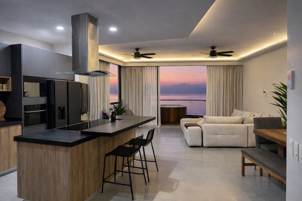Located in Alamar, gated community in La Cruz de Huanacaxtle. This open plan loft-like with living, dining room, kitchen gives an astonishing ocean view to the Banderas Bay and Puerto Vallarta; it's fully equipped kitchen, terrace, BBQ, laundry area, elevator, parking spot and luxury finishes.