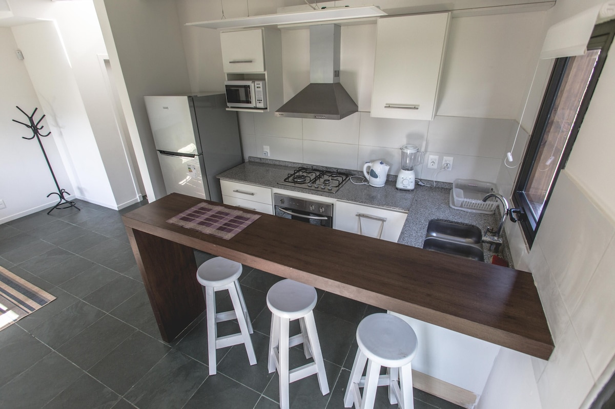 The “Cuatro Picos” houses are 2 independent twin houses that are 100 meters from the beach in the Anaconda area. They are designed to enjoy nature. They have two large wooden decks, roofed with a grill to enjoy the outdoors. Large windows. Our guests get a 15% discount at the OLIVA Restó restaurant in the heart of downtown, Avda. Solari and Del Navío.