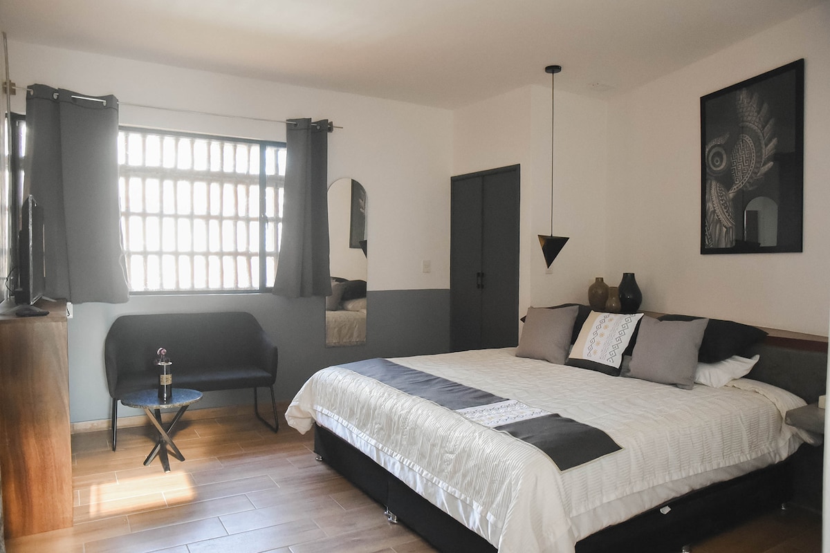 Welcome to Tiny Studio: Your Ideal Getaway in Zapopan Discover Tiny Studio, a modern and cozy retreat designed to offer you the utmost comfort and tranquility. Located in a charming residential neighborhood south of Zapopan, this studio combines relaxation, style, and a peaceful atmosphere. Surrounded by cobblestone streets, it’s the perfect place to disconnect from the hustle and bustle, yet still have easy access to everything the city has to offer.