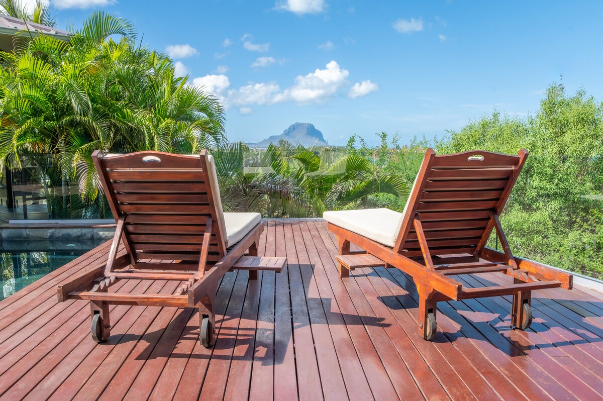 Mountain views are for the birds! ;-) Centrally located, 350m from a well stocked supermarket, and 3 minutes drive to the beach, this cosy home invites you to relax or go out to a wide ranging choice of restaurants nearby. In a tranquil dead end, surrounded by greenery, enjoy sitting on a wooden terrace, overlooking the common pool or relax on the 1st floor balcony while watching stunning tropical sunsets and sea views, overlooking Le Morne. Cleaning service three times a week included