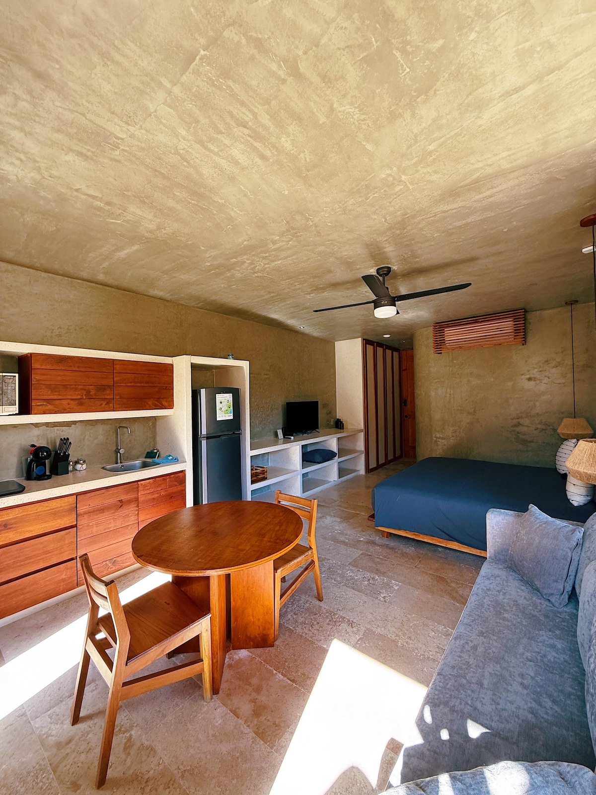 Comfy and centrally located condo in the heart of La Veleta Tulum, on the 2nd floor, with stores and restaurants within walking distance. Enjoy a large rooftop terrace with pool, sun beds and tables. The condo comes with 1 king size bed (in extended living room), 1 double bed (in bedroom), a fully equipped kitchen, 1 spacious bathroom, smart TV, A/C, 400 Mbps Wifi, and large dining table. The boutique building has an elevator and is only 10 minutes from Tulum's spectacular and beautiful beaches.