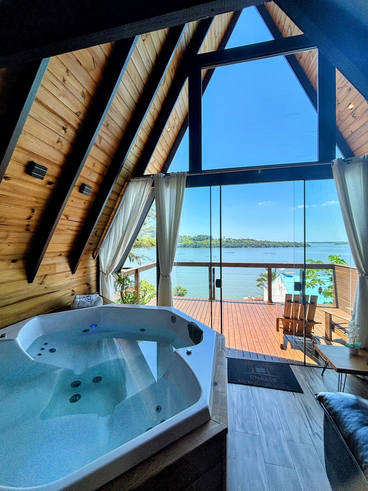 Experience unforgettable moments in a cozy chalet, perfect for those seeking rest, comfort and contact with nature. With an enchanting view of the lagoon, the space was designed to provide a unique experience of relaxation and tranquility. The chalet has an equipped kitchen, fireplace, cozy living room, balcony with a view, and a complete leisure area: private pool to cool off and kayak ride included!