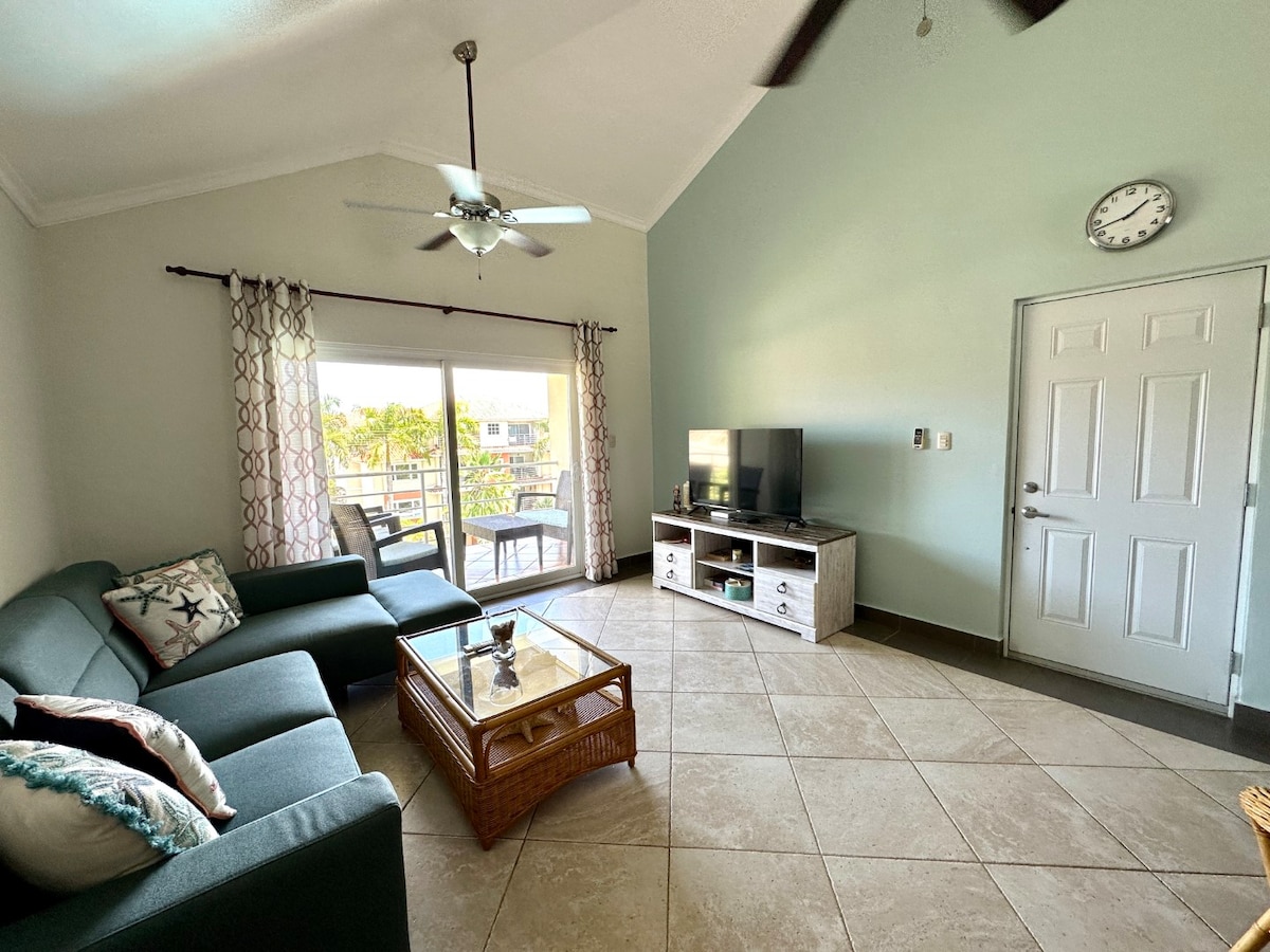 Located on the 3rd floor, this comfortably furnished apartment offers breathtaking views over the pool, garden and ocean. The small kitchen offers everything you need for cooking,ceiling fans, TV, internet with its own modem in the living area, bathroom with small hand washing machine, bedroom with air conditioning and queen bed