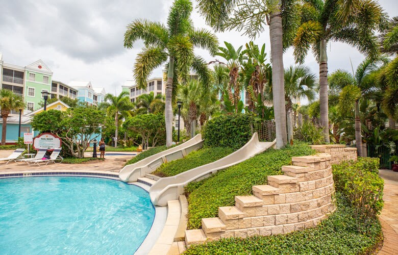 Bahama Bay Resort & Spa offers the area's best value on 3-bedroom family villas. Each villa is beautifully appointed and fully equipped with all the comforts of a contemporary Florida home, combined with all the amenities of a full-service resort. Our 3-bedroom Abacos villas offer a spacious 1,232 SF of space located on the top 3rd floor of the building with no elevator. It is particularly suitable for energetic family who do not mind walking up a few stairs as daily routine exercises.