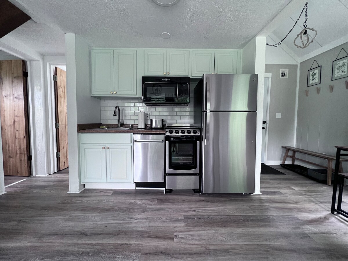 Our retro inspired chalet offers a secluded forest setting with excellent access to convenient amenities! Our family-friendly space comfortably sleeps 6 guests. Each room has been thoughtfully appointed for your convenience and authentic aesthetic. The entire home is yours to use. The fully equipped kitchen and laundry room are a great bonus. On Sunny and rainy days alike- sip a fresh cup of coffee on the spacious front porch. An attached 3 car garage and driveway allows for ample parking.