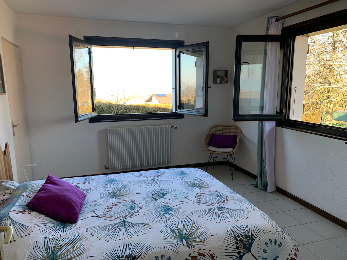 A place of calm and beauty close to Geneva: comfortable, quiet , renovated with love 1BR studio apartment (32 m2), part of our lovely home with independent entrance, own kitchen, bathroom w/ shower, big garden, high-speed WiFi, TV, bikes, next to town, countryside, hillside forests. On a quiet road with no through traffic. Geneva-airport/Nyon 15 min by car. Public transport access ca20 min walk or by bike. Ideal for recreation & business. Good value in an expensive region.