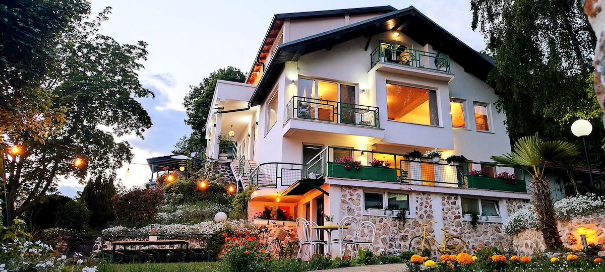 Between the lake and the mountain our villa is located where you can enjoy in the beautiful nature of the National park Galicica and still be close with walking distance to the lake. Stylish Villa with full accommodation 2 bedrooms, bathroom with hot tub, full-equipment kitchen, living and dining area, huge TV, air conditioner, WI FI, lake view balcony, maintained garden with a natural fountain, BBQ area... Free reserved parking.