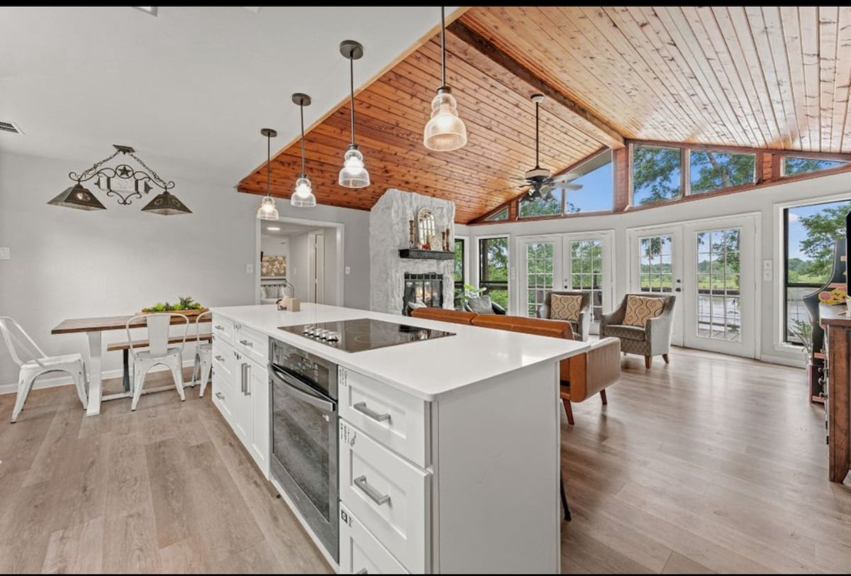 NEWLY PAINTED- new countertops, vanities, fixtures, interior paint, flooring for entire house, furnishings and decor, TVs, board games, and Amazon Alexa, enclosed back patio gates for children & pet safety. NEW dining deck with string lights. Huge fenced backyard area! Beautifully shaded waterfront home. Perfect for swimming…sandy smooth lake bottom and amazing cold pockets that keep you cool on hot days! Enjoy fishing & bring your boat- adventure out on Lake Palestine. Fun family time!!!
