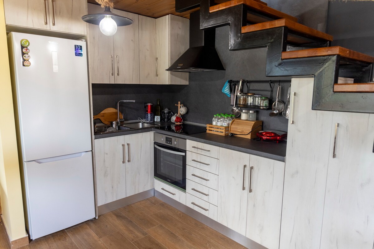 A wooden house of 45 sq.m. in a fenced and wooded area of 2 acres with ornamental trees and plants, vineyard, vegetable garden, large lawn areas as well as a gazebo with barbecue. Make memories in this unique place that is suitable for families with children or for relaxing with your friends away from the sounds of the city. Your pets are also welcome. The distance from the city center is 5 km and from the Mill of the Elves 4 km.