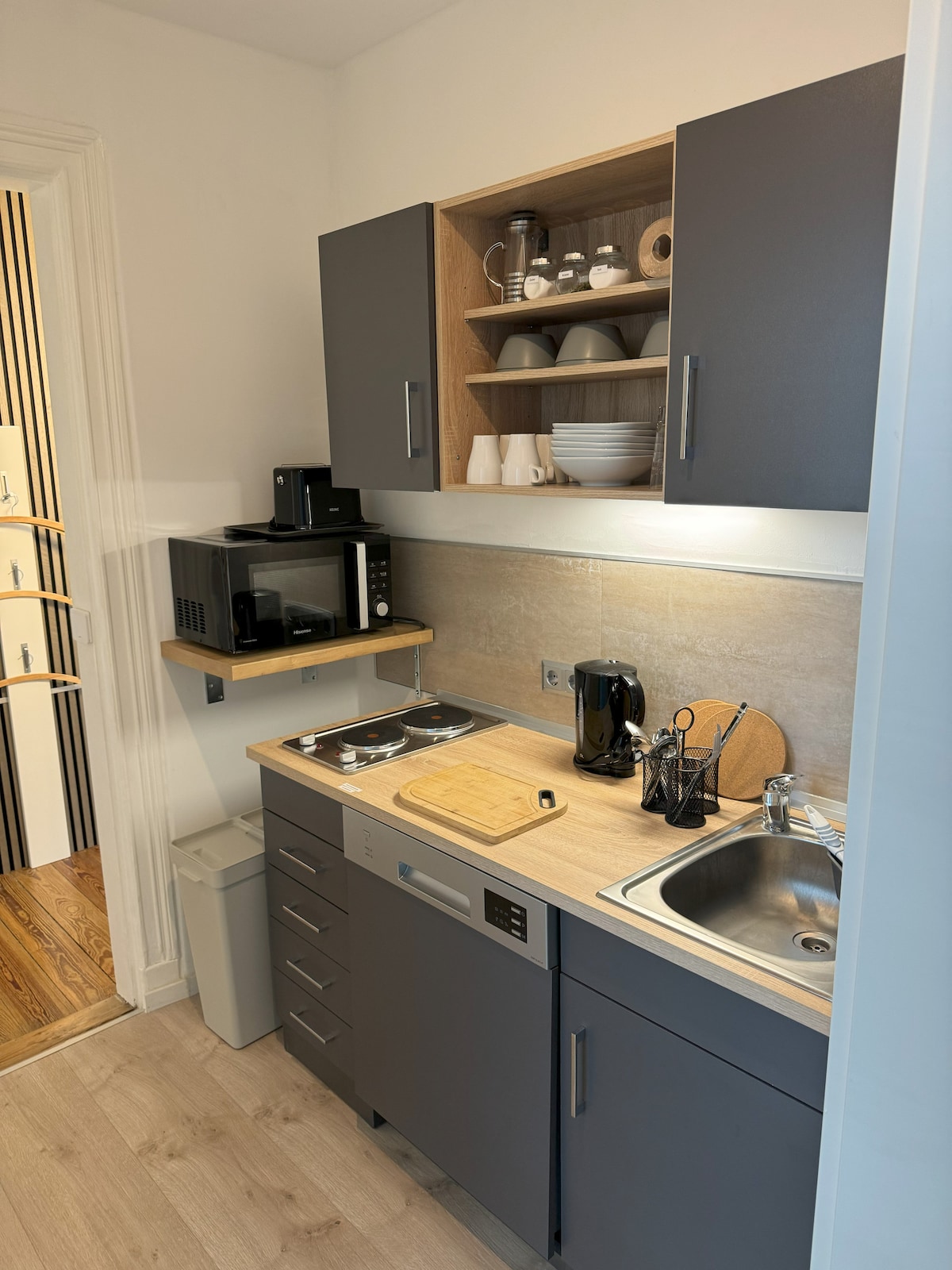 In the closed area of our house. Pleasant atmosphere through clay plaster + wood; beautiful surroundings, very quiet. and close: Ratzeburg (car 5 min), Lübeck (car 20 min). One bathroom; only ONE fast induction hotplate, simple cooking, fridge, Wi-Fi. Double bed (160 × 200). Additional table + chairs in the garden. Free bikes. Bus on B207 junction Buchholz. Very fast to the lake, boating. No animals, no smoking. Limited telephony in the house due to clay plaster depending on the provider.