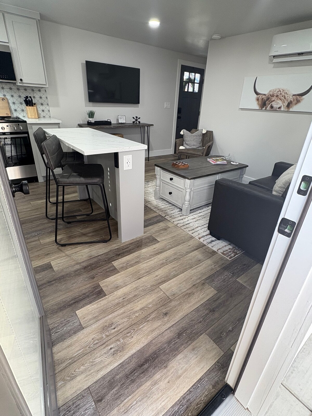 Rustic Highland is a 740 sqft tiny luxury cabin full of warmth and charm, featuring stained cabinetry and boho-inspired accents. The bright living area flows into a fully equipped kitchen, and the spa-like bathroom adds a touch of luxury. The main bedroom has a queen-size bed with ample storage, while the loft offers another queen bed and stunning canyon views. Outside, enjoy the private patio with a bistro table and grill, all set on the edge of Palo Duro Canyon for an unforgettable experience.