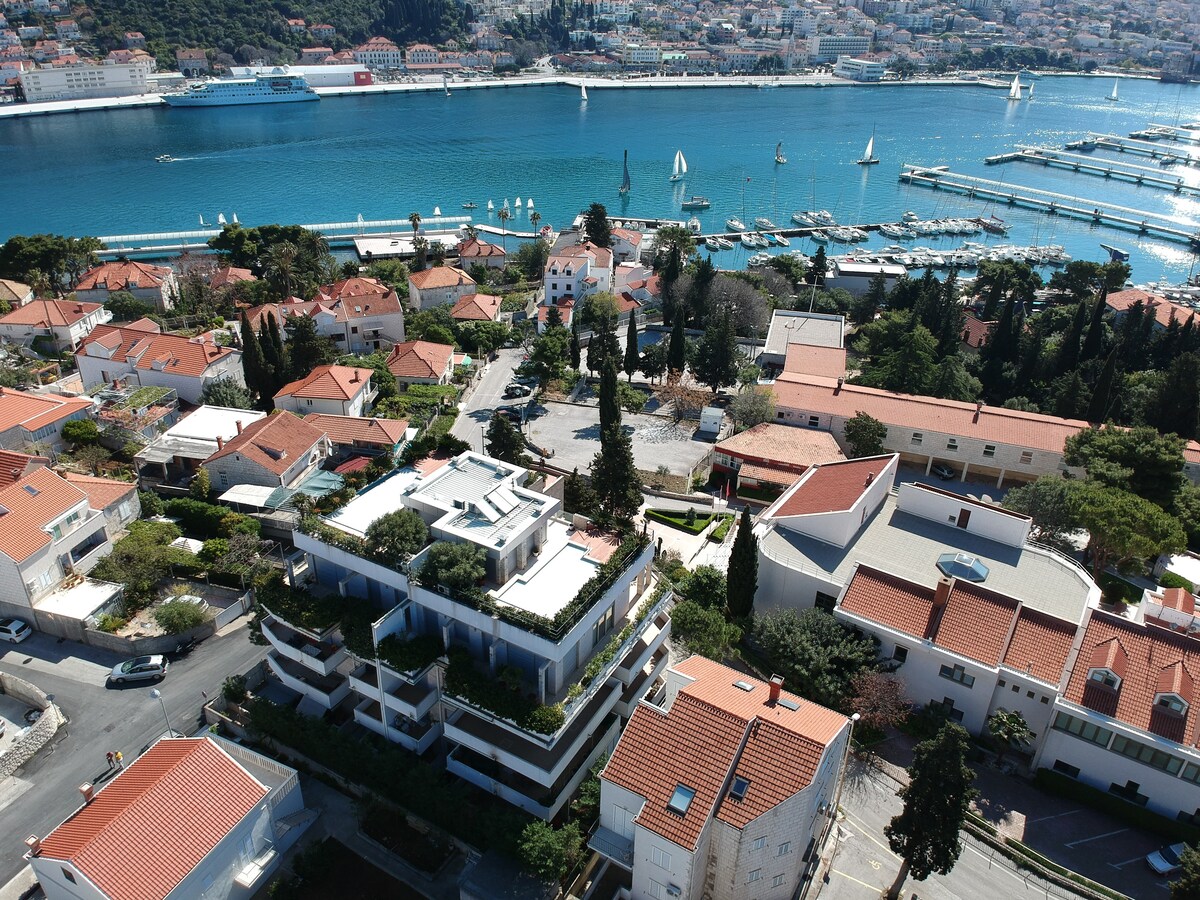 The Apartment "Gallery" is a luxury apartment newly renovated in July 2024. Situated just above the "Sunset beach" in Lapad bay area.You will have: whole apartment (75m2) for yourself, dinning terrace (30m2), chill-out terrace (50m2) / a private garden area and a private parking. Apartment is part of the "Marijan” gallery built by Marijan Kockovic, a world renowned artist. Spend your holiday in an artistic environment, surrounded by cypress tree forrest and 50 marble and bronze sculptures.