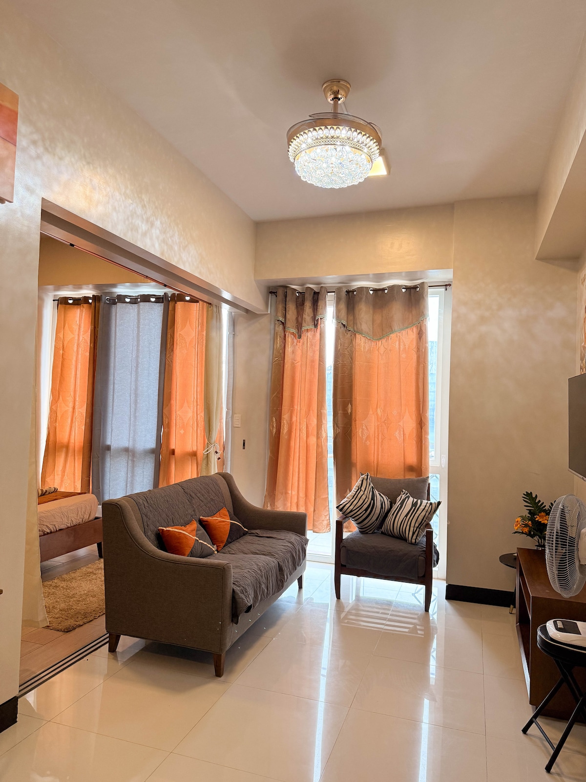 Spacious 2BR condo (80 m²) in Cebu City with large living area, balcony and cool mountain breeze. High floor with relaxing mountain views, perfect for longer stays and workations. Enjoy your own private sauna room, fully equipped kitchen, smart TV with Netflix and ad-free YouTube Premium, and super-fast 400 Mbps fibre Wi-Fi. Building has gym and pool (guards may charge ₱100/person). Central location with easy access to malls and restaurants and free parking slot for guest convenience.