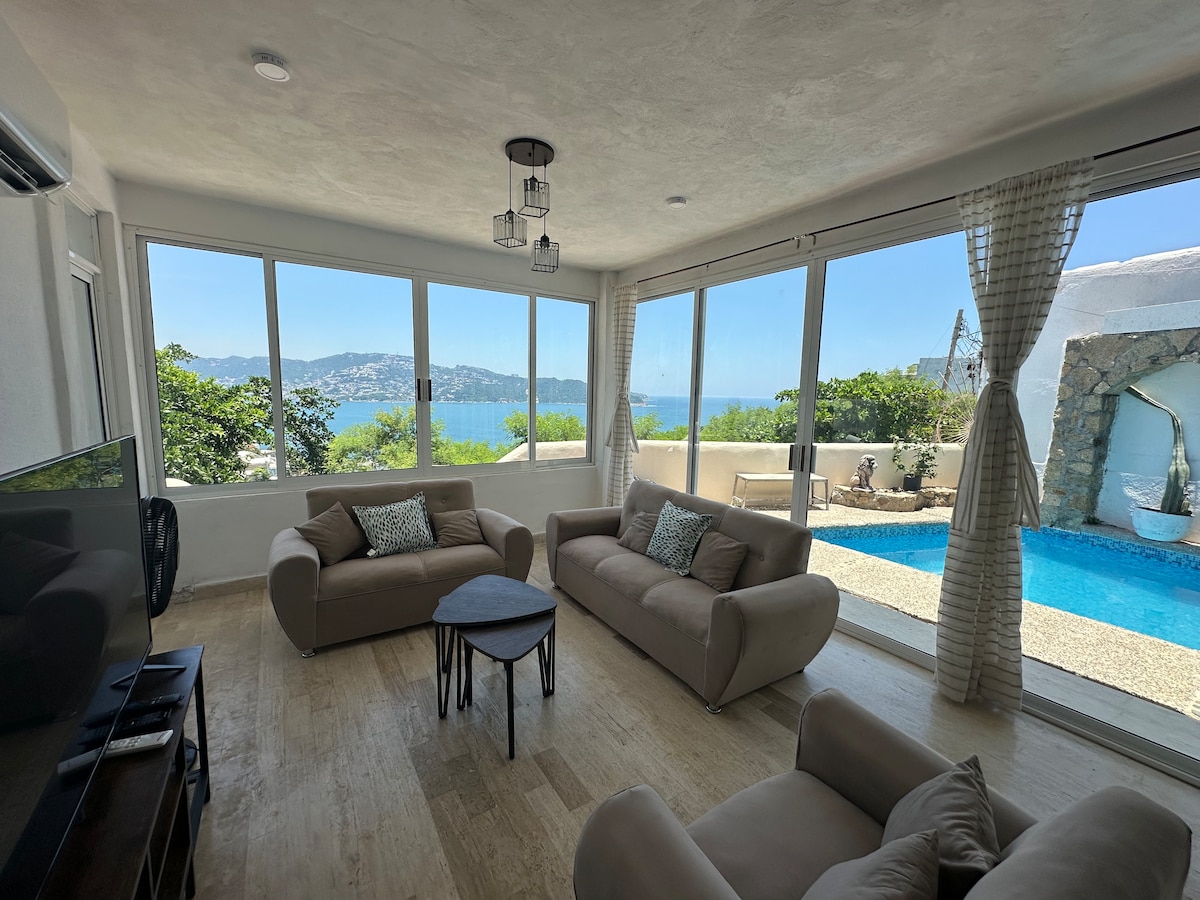 Hermosa vista al mar y a toda la bahía de Acapulco desde una confortable terraza al aire libre, ideal para descanso en pareja o en familia. Áreas abiertas y alberca privada, con exclusiva vista panorámica y a 5 minutos de las playas Caleta, Caletilla & la isla de la Roqueta a 3 min. del Club de Yates y a 10 min. del famoso atractivos turísticos del Clavado de la Quebrada.