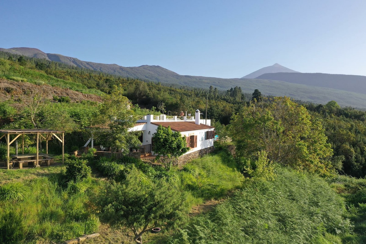 Welcome to our jewel in the mountain! Discover our house, on a private estate at an altitude of 1000m, surrounded by trees and fruit trees. The GR trail awaits you a few steps away, ideal for sports and walks. You can enjoy a swim in our charming pond with unparalleled views of Mount Teide. Discover the magic of nature from the comfort of your temporary home!