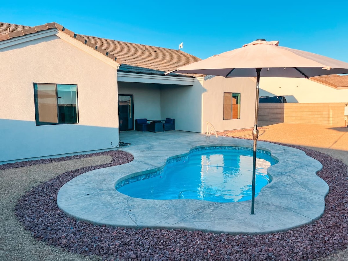 Welcome to our Desert Oasis. We have the perfect spot for you!! Enjoy a day at the lake, an afternoon on a Razor or a night at the casino our home is the spot to enjoy the beauty of Arizona desert. Enjoy Netflix on 80in TV or lounge in the volleyball pool(3.5 sides/5ft middle). BBQ and dine under covered patio. Friendly neighborhood. Quiet hours: 10pm-7am. Parking in driveway and street (no garage access) side parking for razors. no pets, NO SMOKING! ABSOLUTELY NO FIREWORKS!!