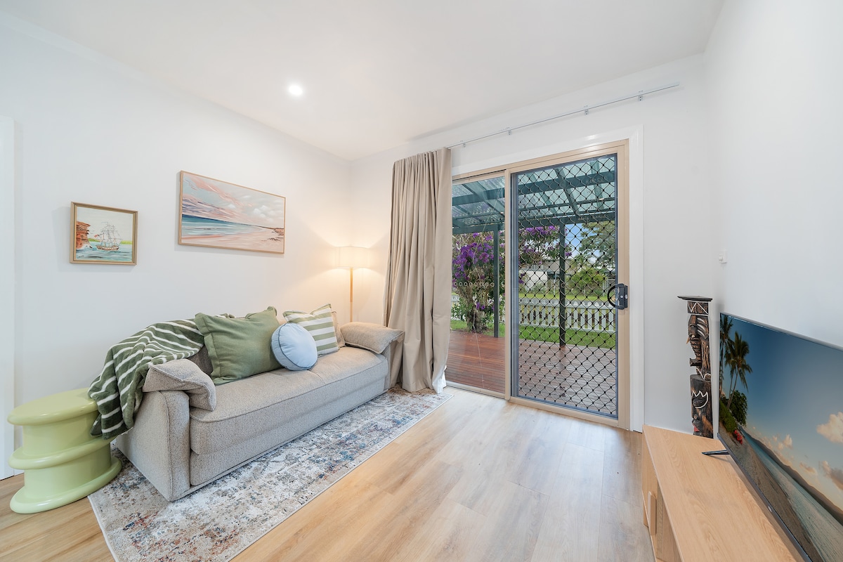 Stylish modern self-contained unit adjacent to the river, enjoy the water views from your private deck. Located just a short walk to cafes, restaurants, club and pub. 5 minute drive to beaches. Unit has free wifi, Netflix, dishwasher, under bench fridge and freezer, microwave, oven and cooktop. Tea, sugar and pod coffee system provided. Private bedroom with queen bed, bathroom separate toilet. Fans in every room with air-con throughout. Linen, hair-dryer, iron and ironing board provided.
