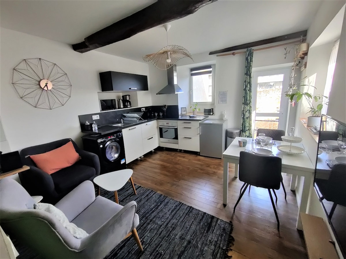 Situé au 1er étage d’une maison en pierre, cet agréable T2 douillet au thème Jungle vous accueille dans une atmosphère chaleureuse et dépaysante. À l’arrière du bâtiment, vous profitez d’un environnement calme, avec vue sur la cour privée. En sortant de l’immeuble, vous apercevrez la vieille tour de l’église Saint-Martin du cimetière, témoignage du charme historique du quartier. L’emplacement est idéal : Place de la République à 200 m, avec son marché du samedi matin Gare à 600 m