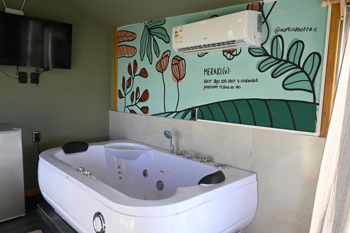 Conocé VillaSerrana hospedándote en un domo de madera, con privacidad, pensado y construído por nosotros mismos. Pensado p/2 personas. Mezclado con la flora autóctona, es refugio de buena energía y hermosos momentos. Es un ambiente que integra sala de estar y kitchenette. Tenemos a tu dispocisón cocina con horno, sillón de dos cuerpos muy cómodo, estufa de alto rendimiento, aire acondicionado, baño con agua caliente. NO inlcuye ropa de cama ni toallas. JACUZZI con tarifa aparte