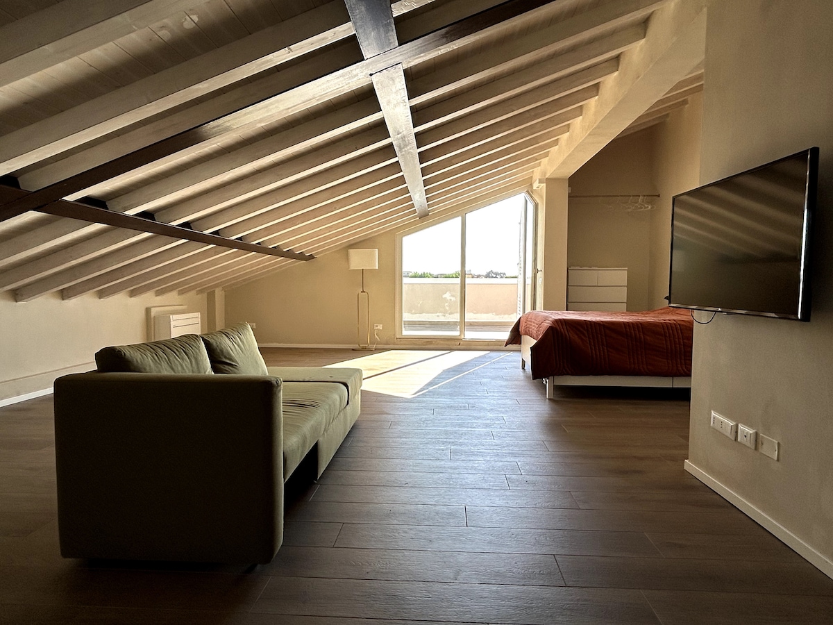 Accogliente open space mansardato, situato al 3° piano (senza ascensore). Questo appartamento offre una splendida terrazza di 20 mq , l’interno è spazioso e luminoso, è dotato di aria condizionata caldo/freddo, garantendo comfort durante tutto l'anno. Il bagno include un lucernario Velux che favorisce una buona ventilazione naturale. La cucina è completa di tutto il necessario, compresa una lavastoviglie. C è un noleggio bici a 600 metri circa , la spiaggia dista 1,2km,la stazione treni 1,5km