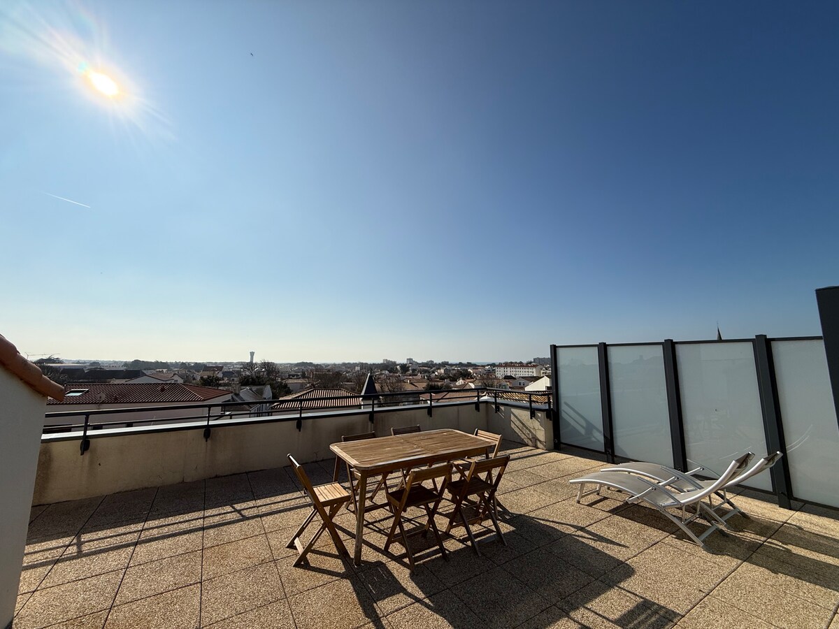 Facing the sea: enjoy an exceptional panorama. Beautiful 2-room apartment (2/4 people) renovated in 2024 – GREAT COMFORT. The beach and dune are at the foot of the apartment (no road to cross). Remarkable ocean and Île d'Yeu views from the dining area, loggia and even from your bedroom bed. Admire the sunsets as a couple, with family or friends. You have your own closed garage; ideal for your car and for storing bicycles, trailer and beach games.