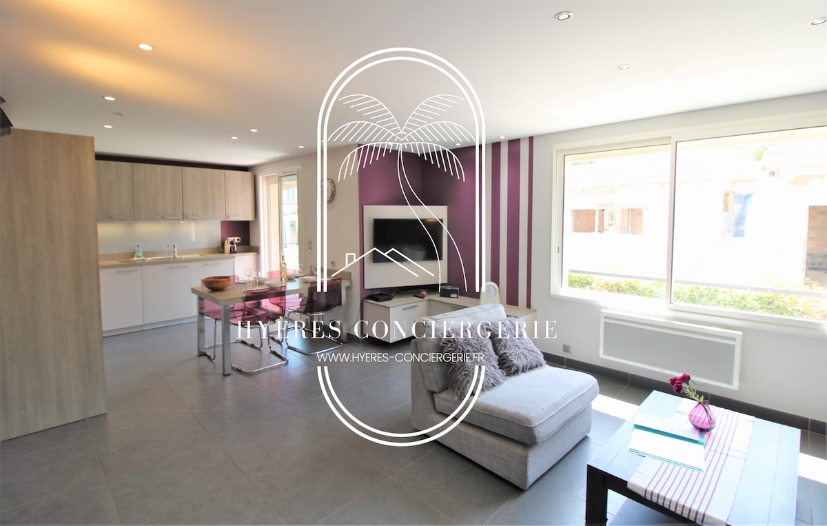 Enjoy a beautiful 29 m2 apartment, refurbished, elegant and located in the heart of the charming town of Carqueiranne. You can come as a maximum of 3 or as a couple with 2 small children. Assets: • Large 21 m2 garage included with your stay • Balcony overlooking a wooded view and south-facing • 4 min walk to the port and beaches and 5 min to the city center. • Located near the bike path overlooking the most beautiful walks in the area • Quiet and secure residence
