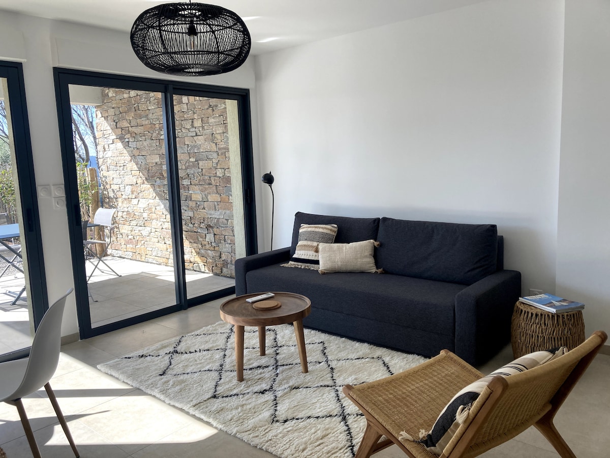 Bright and spacious apartment of 90m² on the 1st floor of a family house, with open sea view and private southern terrace. Located in a quiet environment, just 2.4 km from the beaches and in the immediate vicinity of the trails, it is ideal for savoring a breakfast in the sun or an outdoor evening. Completely independent entrance, secure private parking and full reversible air conditioning for optimal comfort.