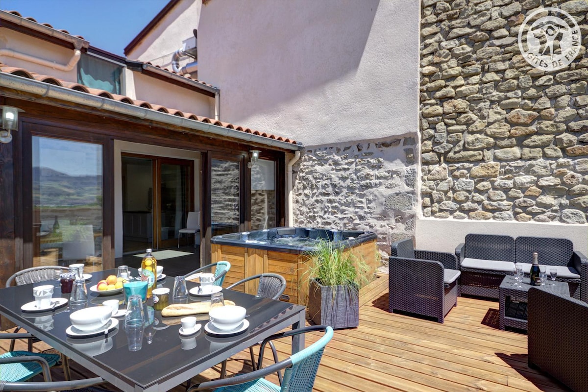 Offrez-vous une escapade romantique dans une ferme du 18ᵉ siècle rénovée. Studio chaleureux avec vue panoramique sur les montagnes, jacuzzi & sauna privatifs, sans vis-à-vis. 🌹 Champagne, fleurs & pétales disponibles pour sublimer vos soirées. Espace extérieur cosy avec barbecue, à 5 min des restaurants & rivière. 📍35 min St-Étienne, 10 min Yssingeaux, 30 min Le Puy, 10 min passerelles himalayennes.
