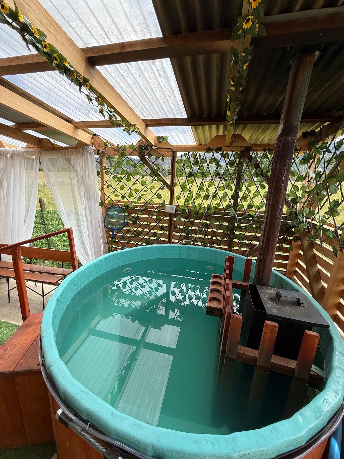 Bello entorno para descansar o disfrutar. También alojamiento de paso. Un oasis cerca de todo. Además está adecuado para paseos de cursos, instituciones o capacitaciones, etc. No te arrepentirás de visitarnos. Tinaja con valor aparte. Cabaña equipada para 7 huéspedes con valor de $ 75000. Más huéspedes cancelan valor extra. Senderos autoguiados, juegos infantiles, sillon gigante, árboles nativos. Alojamiento para Empresas.