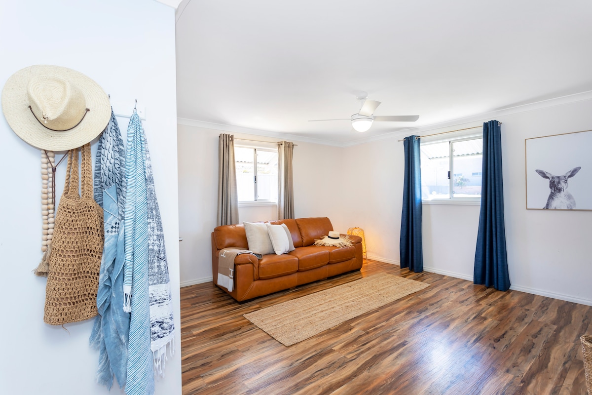 The Hula Shack is a relaxed and cosy holiday house with a subtle Hawaiian theme. Evoking the casual beach shack vibe of a bygone era. A compact modern kitchen and stylish contemporary bathroom provide a high level of guest comfort. Free unlimited wifi, 55" tv and comfy sofa. Hula shack is close to everything. Guests have exclusive use of the large garden with lawns and shady trees. Enjoy the hot/cold private outdoor shower amongst greenery. No pets at this property.