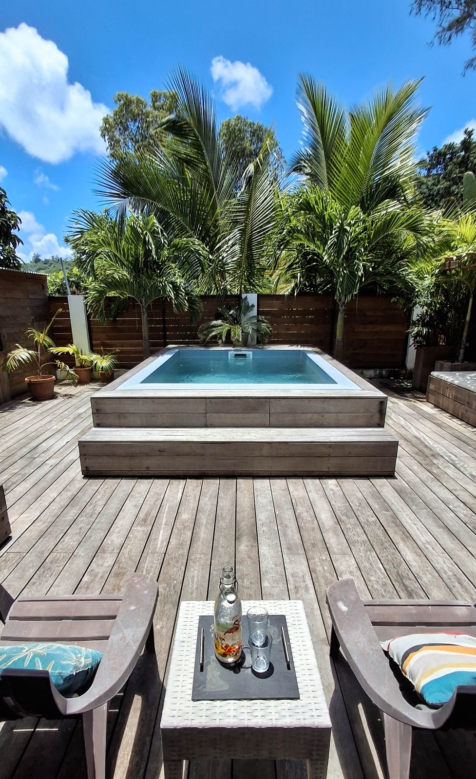 This luxury, quiet, elegant, and conveniently located accommodation invites you to relax. Private access by a comfortable staircase of 63 steps will be immediately rewarded by the magnificent view, the spacious deck with its small swimming pool and the discovery of this cozy and peaceful nest. After a morning of activities or snorkeling, rest in the afternoon, in the sun, on the deckchairs...