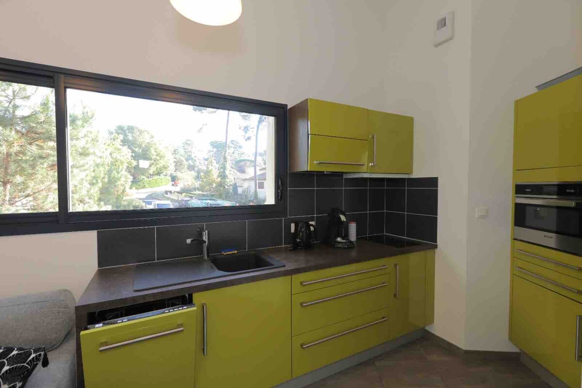 Studio and separate entrance! In a small quiet corner on the edge of the woods and only 800 m from the beach. From the terrace, you will hear the squirrels jumping from branch to branch. You can take the bike path 50 m to reach the nearest shops 200 m away (bakery, fishmonger, greengrocer, wine cellar, etc.). In the evening, taking advantage of the last rays of sun, you will be transported by the sweet scents of strawberry trees and mimosas mixed with the spray of the basin.