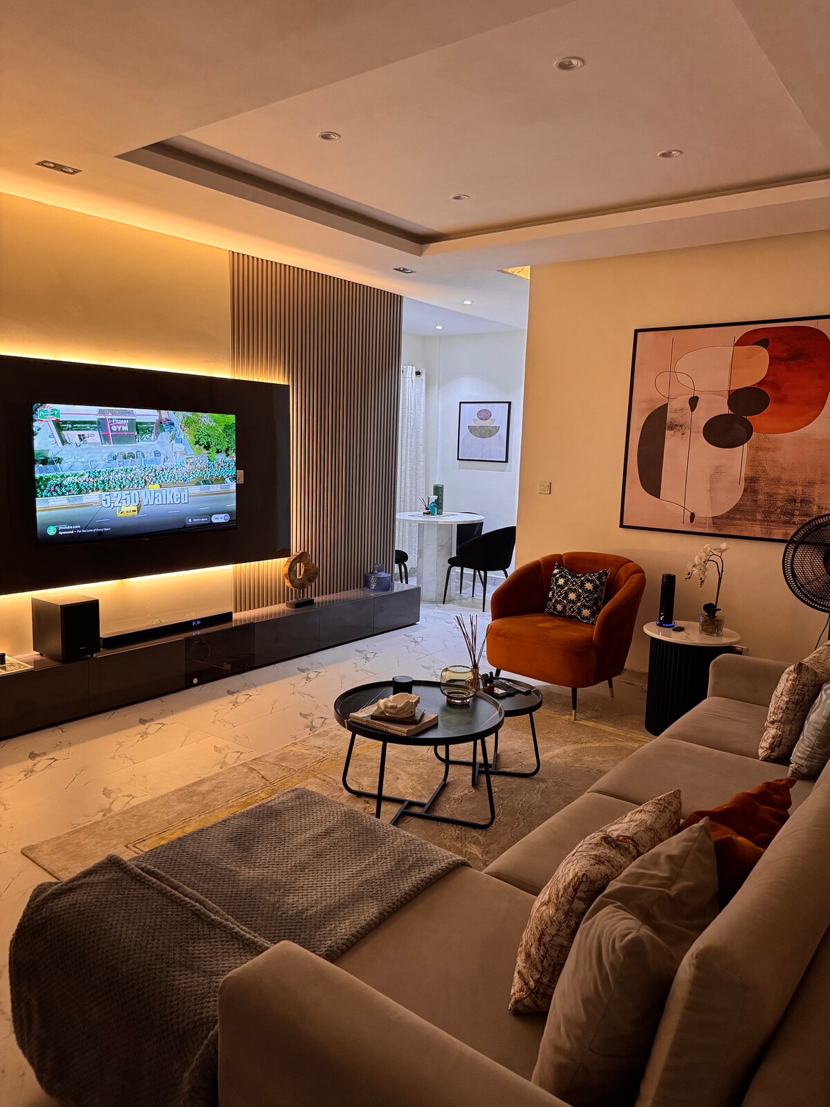 " Beautifully furnished 2 bedroom apartment located in a gated and secured environment within Lekki. Equipped with smart tvs (Alexa, Netflix and amazon prime), unlimited internet, 24 hrs power supply/Solar, DSTV premium, Ring video bell, fully air conditioned, water heaters, card/board games, parking space, fully equipped kitchen with microwave, refrigerator and kitchen utensils, washing machine, house keeper and/or in chef on request". We are here to give you a home away from home experience