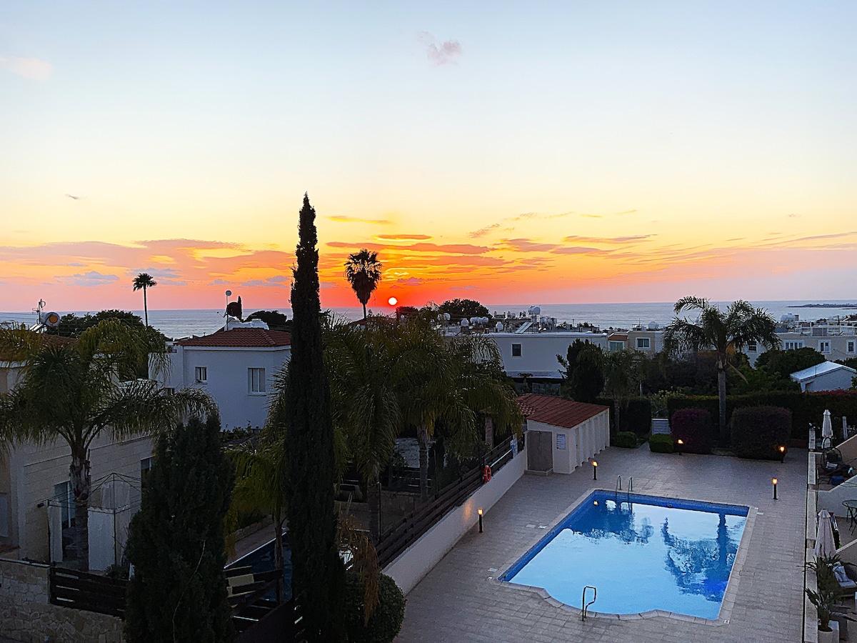 Wake up to panoramic sea views from Paphos Lighthouse to Chloraka coast, and enjoy a newly renovated, stylish apartment with a large balcony in a resort-style complex. This bright 2-bedroom apartment features an airy open-plan living area, a modern fully equipped kitchen, and a fresh bathroom with rain shower. Step onto the spacious balcony to dine, relax, or sunbathe, and enjoy the large communal pool surrounded by lush greenery—perfect for a relaxed Mediterranean holiday or remote work