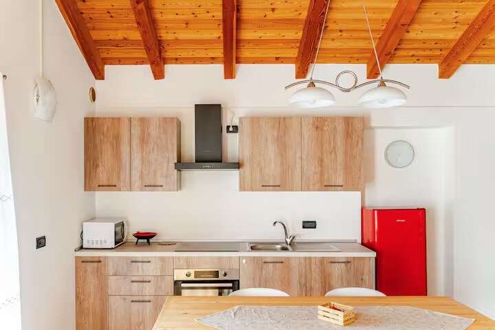 The Essence apartment is an open space with a double bed, a bathroom with a bathtub and shower, an equipped kitchen, a large balcony, and a veranda overlooking the house's garden. The wooden floor and the wood stove in the center of the living area convey the warmth of the environment. A cozy and intimate atmosphere for a relaxing and rejuvenating stay.