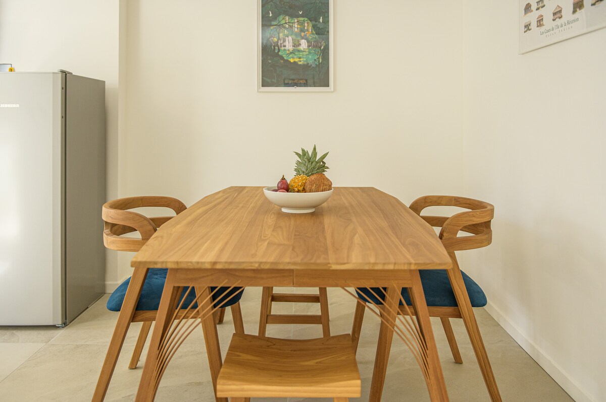 Splendid new apartment, quiet, in a small tropical garden, on a property 3 min walk from the beautiful Hermitage Lagoon. Eco-friendly 30 m² apartment decorated on the theme "Mango Green" including: a well-equipped kitchen (dishwasher, fridge, stove, oven), a living room with sofa and smart TV, a bathroom with walk-in shower and private garden of 30 m2. Great for a romantic getaway for 2. Premium bedding (160*200) sheets and linens provided. Cleaning included. Airport access 40 min