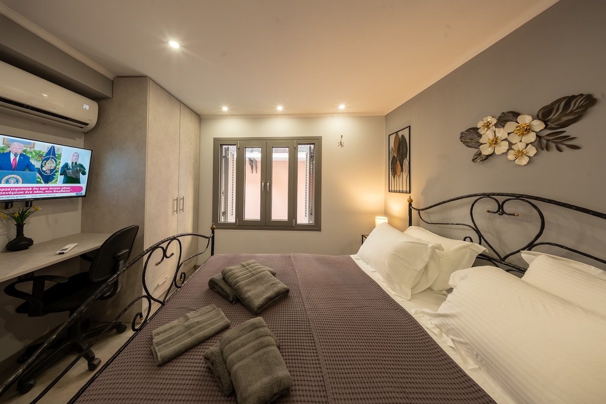 Welcome to our apartment in the heart of Mytilene! Just steps away from restaurants and bars, we offer a comfortable double bed, personal care essentials, a fully equipped kitchen, a washing machine, and an iron. Enjoy free high-speed WiFi, a smart TV with Netflix, and air conditioning. We invite you to experience a unique stay filled with comfort, authentic hospitality, and unforgettable moments.