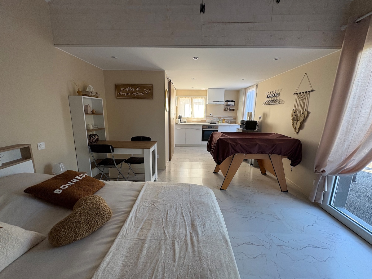 Studio of about 30 m2 composed of a small kitchen, a sofa bed, a dressing room, a mezzanine with a double bed. The place can accommodate up to 4 people. The bathroom is equipped with a shower, toilet, sink, towel dryer. Sheets and towels are provided. Access is through the garage of the house and then you have your private space. Hand delivery of keys between 6pm and 9pm.