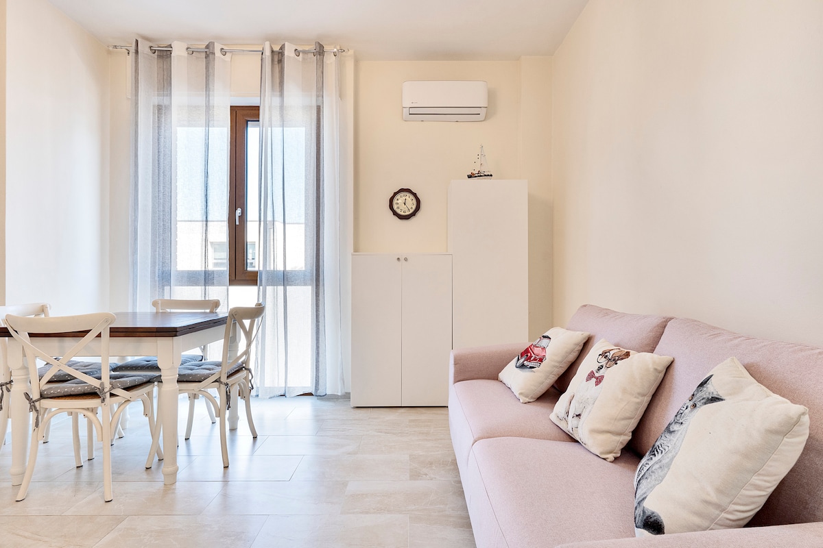 The apartment is on the top floor of a condominium with elevator, equipped with a kitchenette, two bedrooms, two bathrooms and a terrace. Located less than 1 km from the sea, in a quiet area with numerous free parking lots and central to reach the neighboring towns. During their stay, guests can find a children's park, cafes, restaurants, grocery stores, and supermarkets in the immediate vicinity.