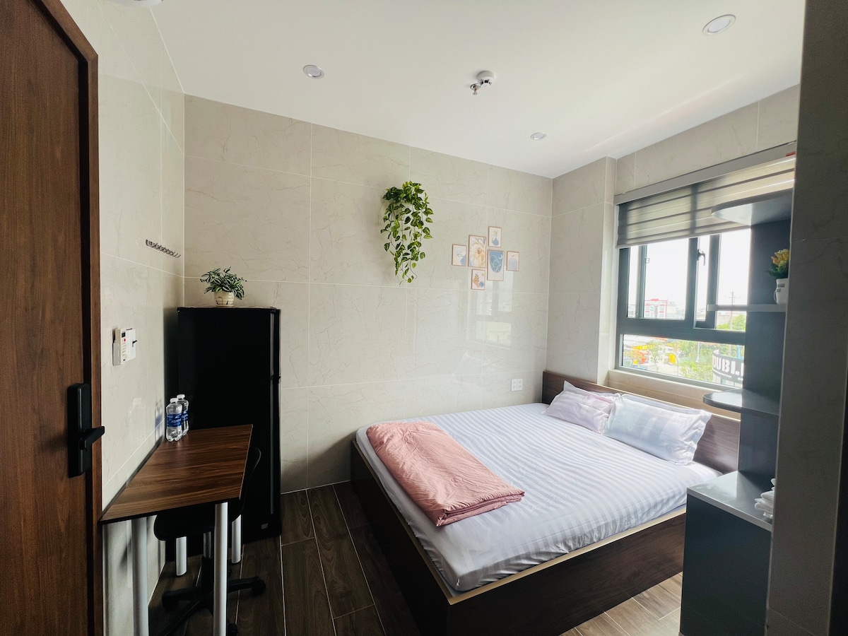 A vibrant local neighborhood just 3 km from Xuan Thieu Beach Near Hoang Van Thai Street — the direct route to Ba Na Hills and the scenic Hai Van Pass. Overlooking Da Nang University of Science and Technology, the area is lively with affordable street food, cafés, and daily conveniences: WinMart – 100 m, Local market & Hoa Khanh Church – 600 m, Mega Market nearby The room features a private kitchen with full amenities, ideal for long stays. Only 9 km to My Khe Beach.