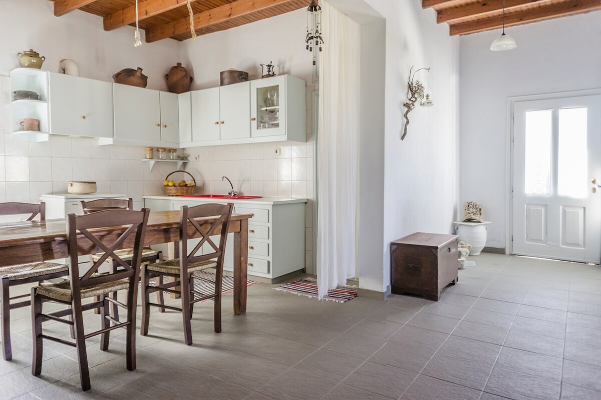 Χαλαρώστε σε αυτό το ήρεμο και κομψό νησιωτικό σπίτι με θέα τη θάλασσα, που βρίσκεται σε απόσταση 300 μέτρων από το γραφικό λιμάνι της Μουτσούνας. Απολαύστε το πρωινό σας στην πετρόχτιστη αυλή και αν είστε τυχεροί ίσως μπορέσετε να το συνοδέψετε με λίγα φρέσκα λαχανικά που θα κόψετε από τον κήπο. Στο εσωτερικό θα βρείτε ένα πλήρως εξοπλισμένο σπίτι με κλιματισμό, μια κρεβατοκάμαρα κι έναν κρεβατότοπο με διπλά κρεβάτια, ντουλάπες και τηλεοράσεις. Το σπίτι είναι κατάλληλο για 1 έως 4 άτομα.