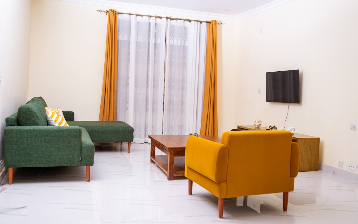 Enjoy a comfortable stay in this modern studio featuring a queen-size bed with mosquito net, air conditioning, ceiling fan, and private bathroom with shower. The kitchenette includes a stove, microwave, and fridge. Stay connected with high-speed Starlink internet and streaming TV. The apartment has solar backup for lighting, Wi-Fi, and TV, plus generator support during load shedding. Water backup ensures uninterrupted supply.