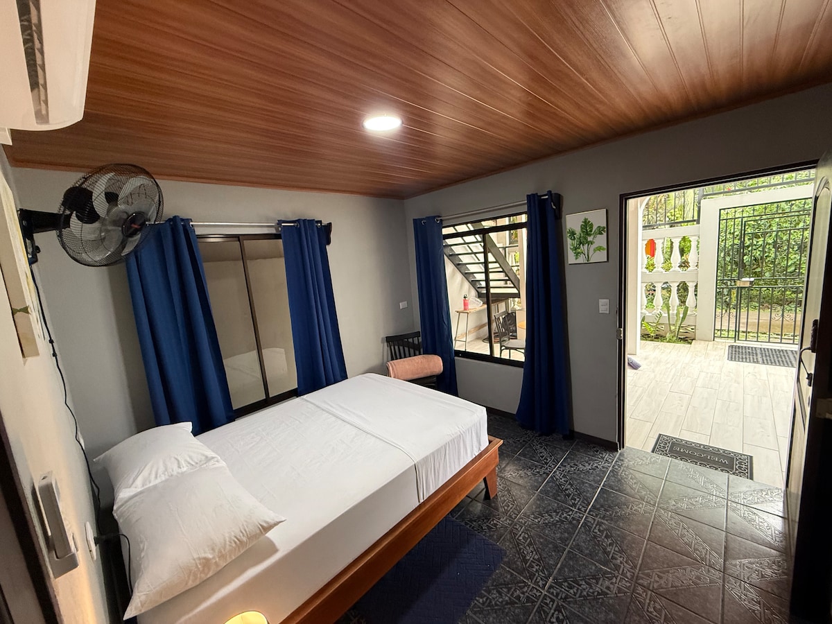 Charming boutique, adult-only hotel with three rooms, one 1-bedroom casita, and one 2-bedroom casa.* This room includes a private bathroom, full size bed, AC, hot water, bidet,linen, fan, closet and desk. Amenities: Pool, bar, Lounge, games, Outdoor shower, bikes, Shared kitchen, Bikes, WiFi, Gardens , limited Secured parking - (please request), Laundry, Barbecue/firepit. Just a 5-minute walk to the beach and a 15-minute walk to Puerto Viejo center. *Click host details for more info.